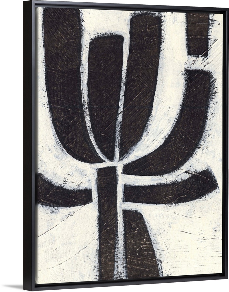 <p>Contemporary mid-century inspired abstract painting using bold black strokes against a weathered neutral background.</p>
