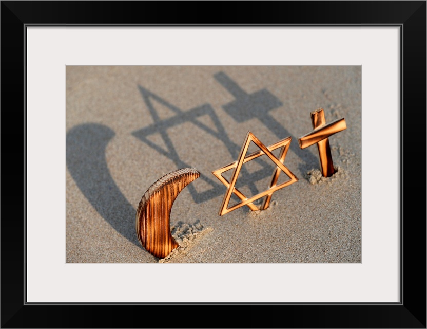 <p>Interreligious symbols of the three monotheistic religions, Jewish Star, Cross and Crescent, for Judaism, Christianity and Islam, Vietnam, Indochina, Southeast Asia, Asia.</p>