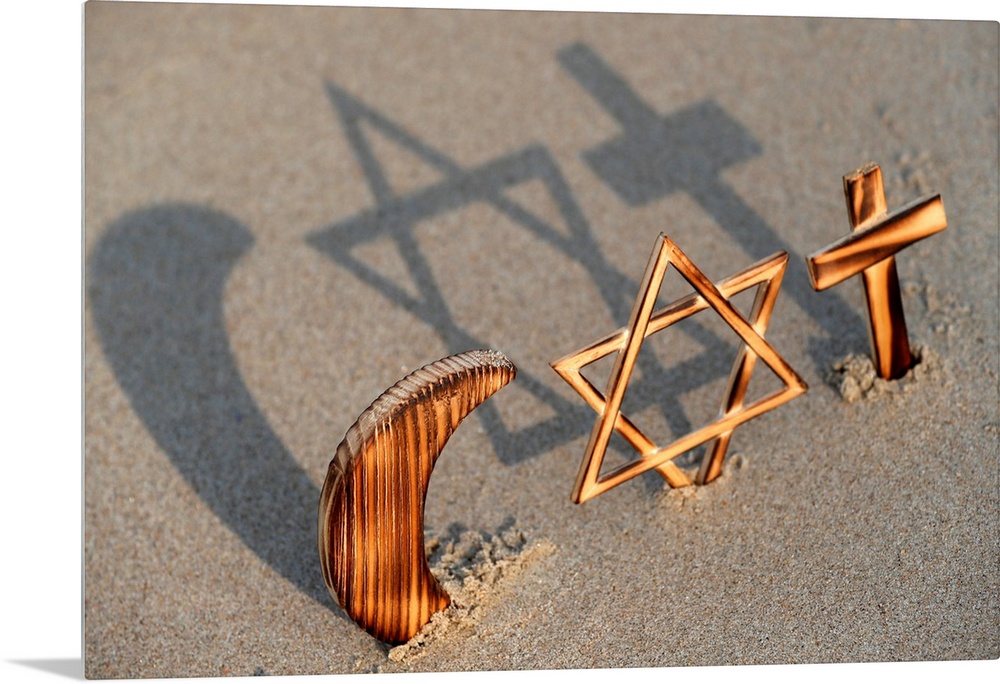 <p>Interreligious symbols of the three monotheistic religions, Jewish Star, Cross and Crescent, for Judaism, Christianity and Islam, Vietnam, Indochina, Southeast Asia, Asia.</p>