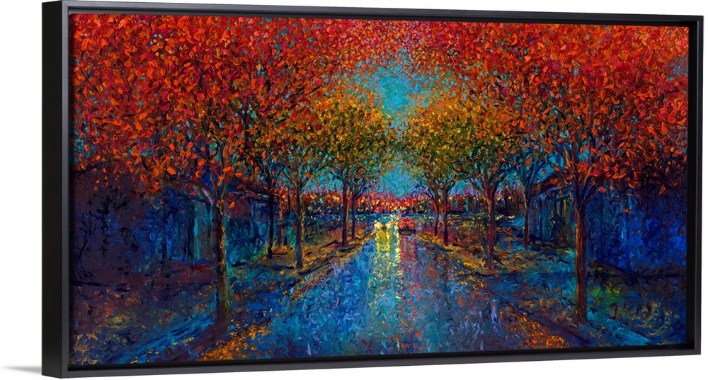 <p>Brightly colored contemporary artwork of a symetrical street lined with trees.</p>