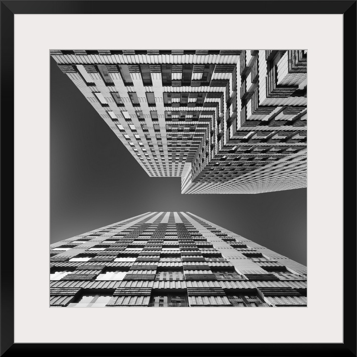 <p>Black and white image of skyscrapers seen from the ground, creating an abstract image.</p>