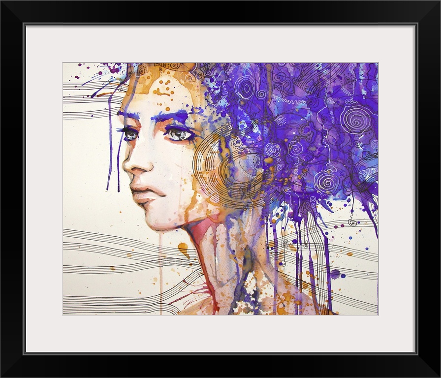 <p>Contemporary watercolor portrait of a woman with elaborate paint Splattered purple hair.</p>