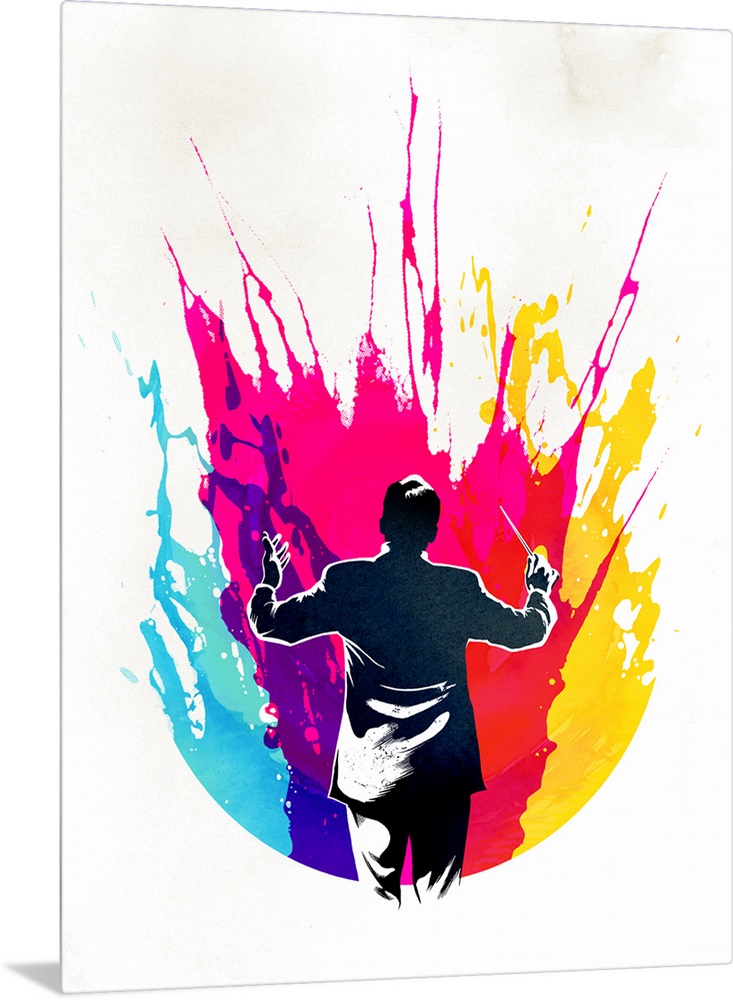 <p>Contemporary artwork of orchestra director directing splashes of color spraying upward.</p>