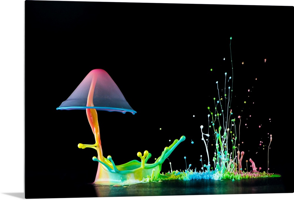 <p>A macro photograph of a colorful tiny splash of water resembling a mushroom.</p>