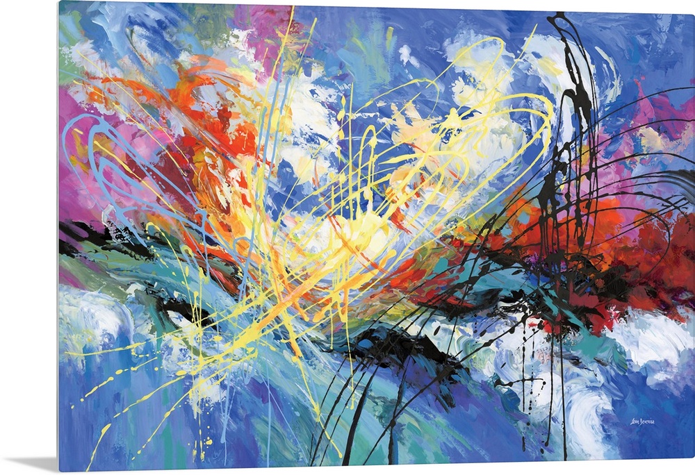 <p>An explosive abstract artwork filled with swirling colors, energetic lines, and bold movement across a vivid blue background. Bursts of yellow, red, orange, and black create dynamic motion, giving the piece a powerful and expressive intensity. This artwork adds a striking, modern energy to any home, perfect for those who love bold color, creativity, and vibrant contemporary style.</p>