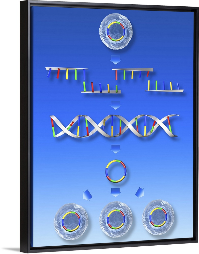<p>Computer artwork depicting the creation of synthetic cells. From top: the chromosome of an existing bacterial cell is decoded, fragments copied and assembled forming a new synthetic DNA. This DNA is used to build a new synthetic chromosome. This chromosome is inserted into bacterial cells which self-replicate themselves and are controlled by the synthetic DNA. These synthetic bacterial cells could be used to develope new fuels, drugs and might even play a role in fighting pollution of the environment.</p>