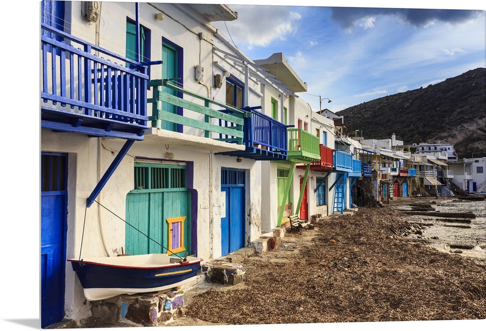 <p>Syrmata, traditional fishermen's encampments with brightly painted woodwork, fishing village of Klima, Milos, Cyclades, Greek Islands, Greece</p>