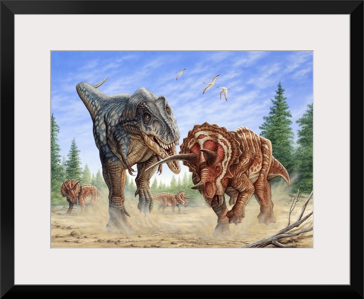 <p>T-rex fighting a group of Triceratops.</p>