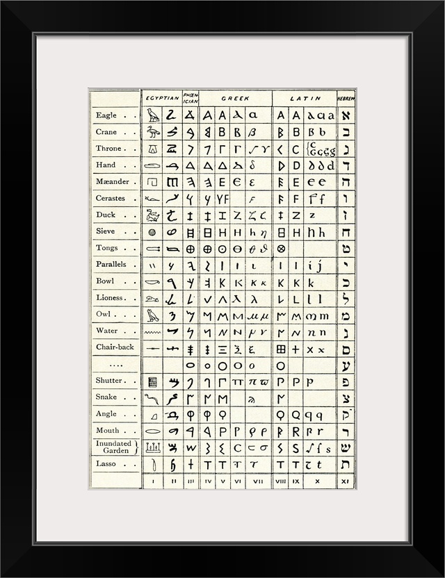 <p>Table comparing ancient scripts. Table based on an 1859 work by French egyptologist Emmanuel de Rouge (1811-1872), comparing eleven types of related ancient and modern scripts. The columns show: (i) Egyptian hieroglyphs; (ii) Egyptian Hieratic characters; (iii) Oldest Phoenician letters; (iv) Oldest Greek letters; (v) Lapidary Greek at the time of the Persian War; (vi) Greek uncials from c.400 AD; (vii) Greek minuscules; (viii) Old Italian alphabet; (ix) Lapidary Latin from Cicero's time; (x) Latin uncials and minuscules, (xi) Modern square Hebrew. Table from The Story of the Alphabet (Edward Clodd, 1900).</p>