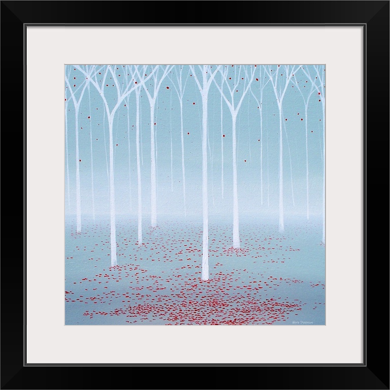 <p>Square minimalist painting of white treed with a few red leaves at the top, and scattered piles of red leaves on the ground, in a blue and white misty forest.</p>