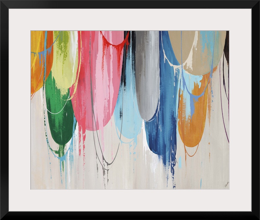 <p>Abstract painting of a cluster of brightly colored half circles that appear to have been pulled and stretched, resembling taffy that is dripping downward in front of a light neutral background.</p>