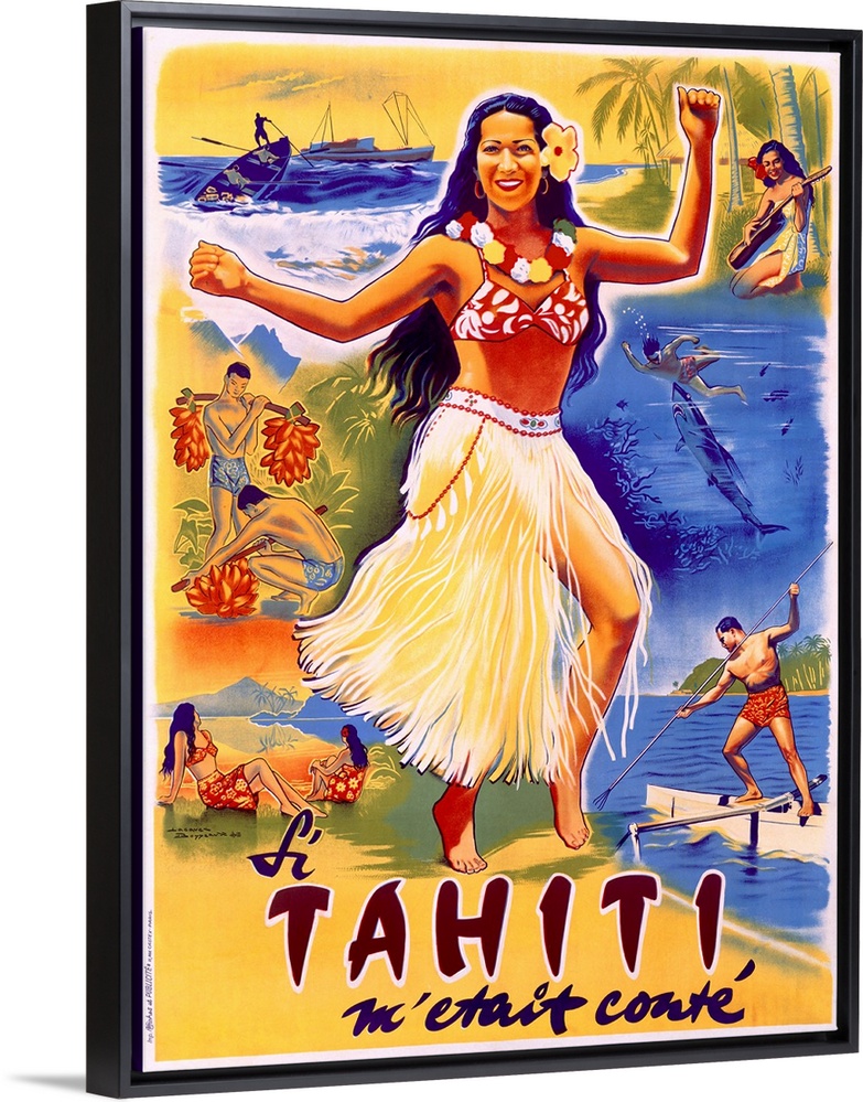 <p>Old print advertising a French Polynesian island. There is a hula girl in the center surrounded by smaller images of people participating in local activities such as fishing, swimming, and boating.</p>