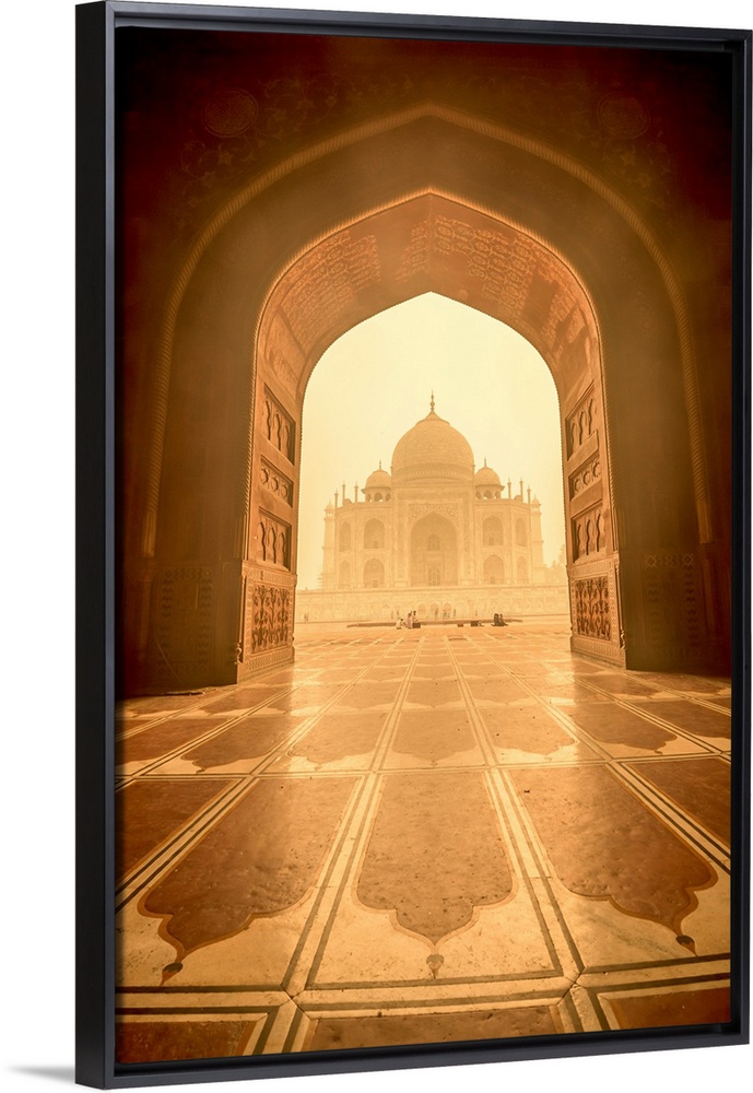 <p>View of the Taj Mahal through a detailed archway with golden sun shining in.</p>