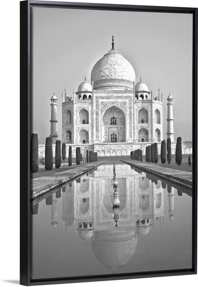 <p>Black and white image of the Taj Mahal reflected in the pool below in Agra, India.</p>