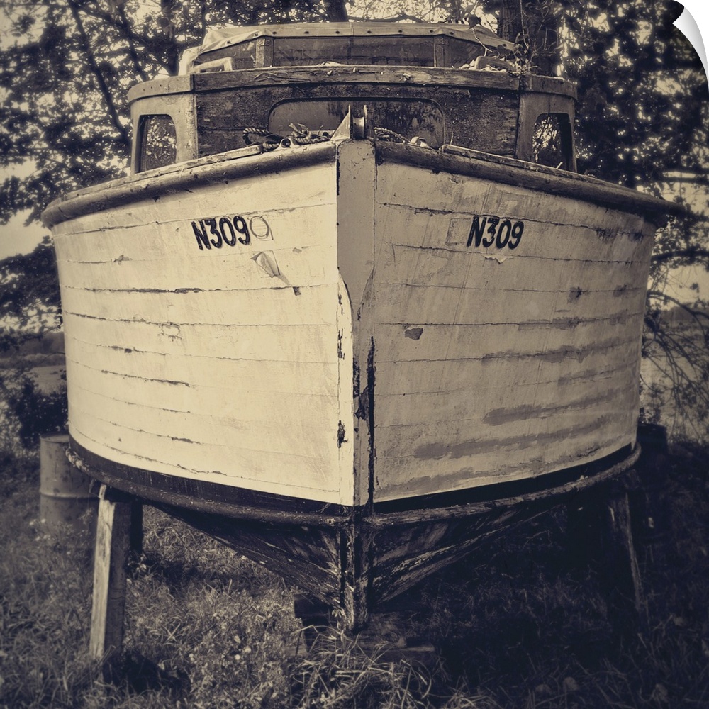 <p>Bow view of an old holiday cruiser moored on dry land under trees</p>