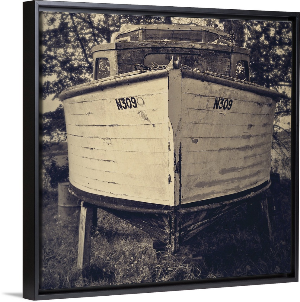<p>Bow view of an old holiday cruiser moored on dry land under trees</p>