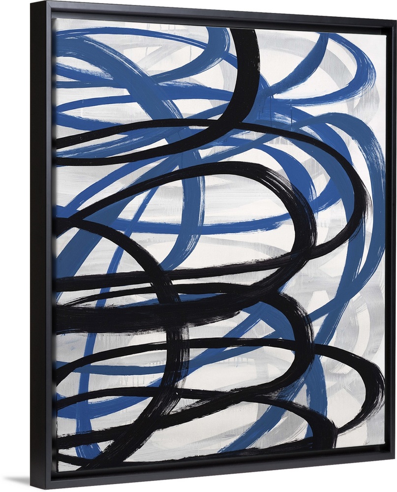 <p>Contemporary abstract painting of a dark blue and black swirling lines against a neutral background.</p>