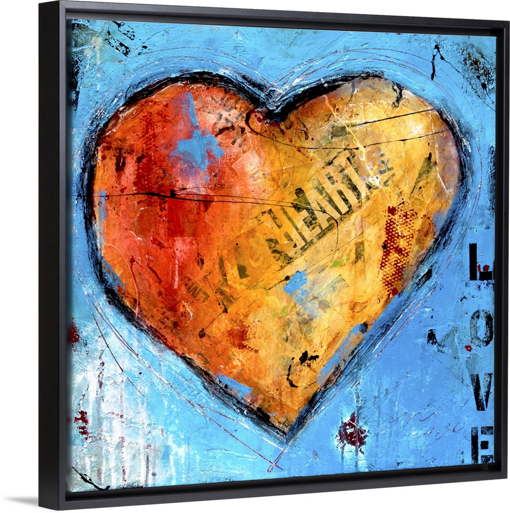 <p>Contemporary artwork of a large orange heart with found lettering on blue.</p>