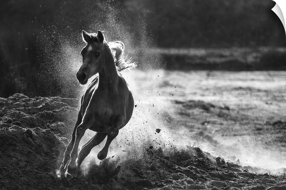 <p>Black and white image of a horse galloping in the sand, kicking up dust behind it.</p>