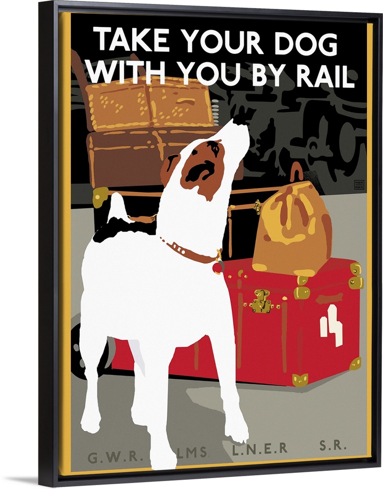 <p>Vintage advertisement artwork for rail travel that accommodates pets.</p>