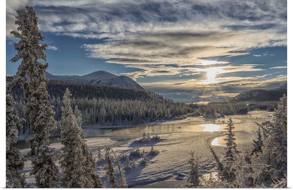 <p>The sun breaks through the clouds above the Takhini River on a late winter afternoon, near Whitehorse. Yukon, Canada.</p>