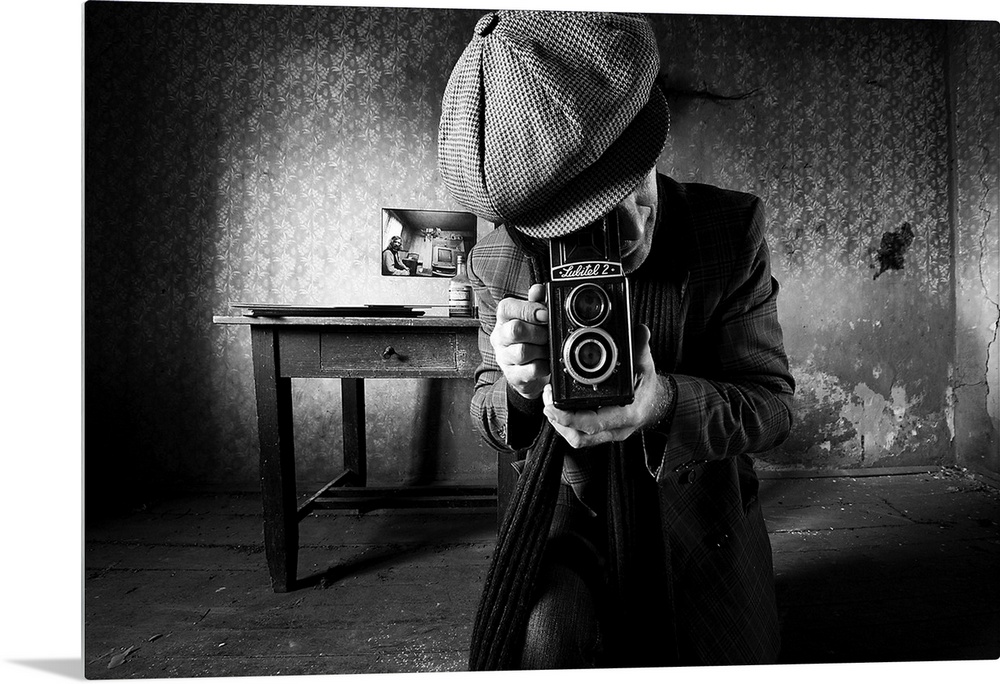 <p>A man taking a photo with a vintage film camera in an abandoned room with peeling wallpaper.</p>