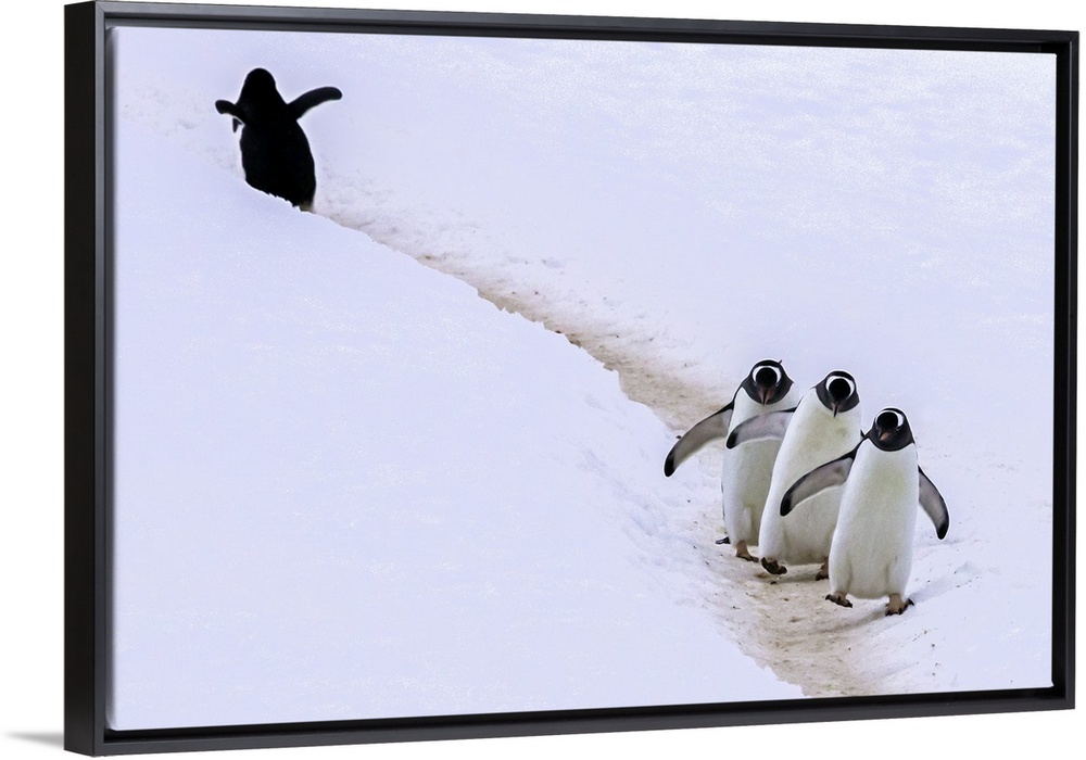 <p>A Gentoo penguin walking off from his trio of friends on a snowy path.</p>