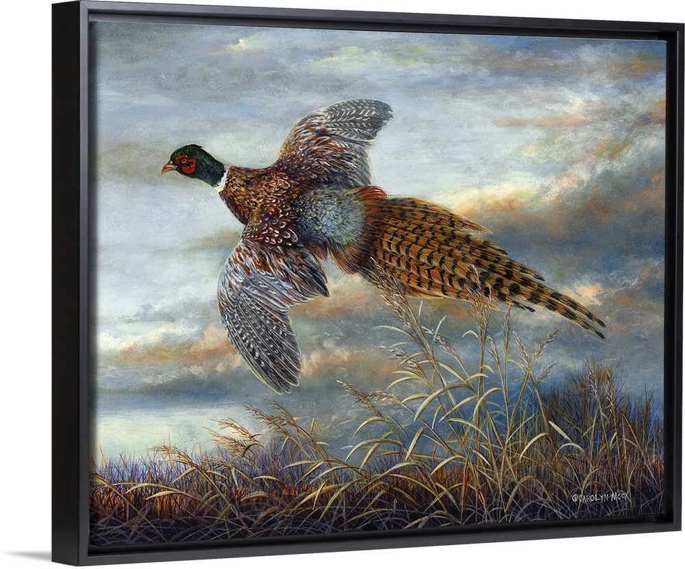 <p>Contemporary painting of a pheasant in mid-flight.</p>
