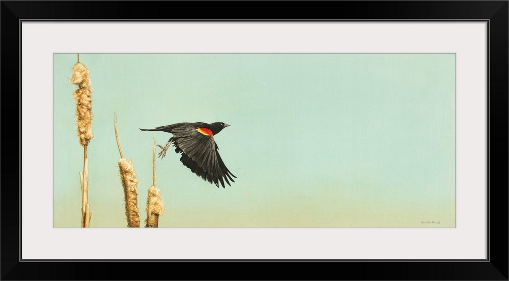 <p>A horizontal image of a bird starting to take flight for a cattail.</p>