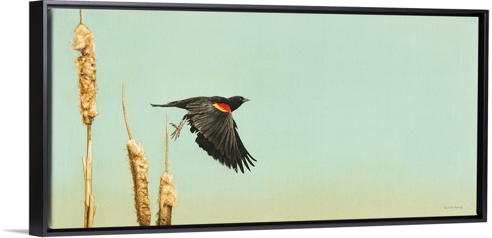 <p>A horizontal image of a bird starting to take flight for a cattail.</p>