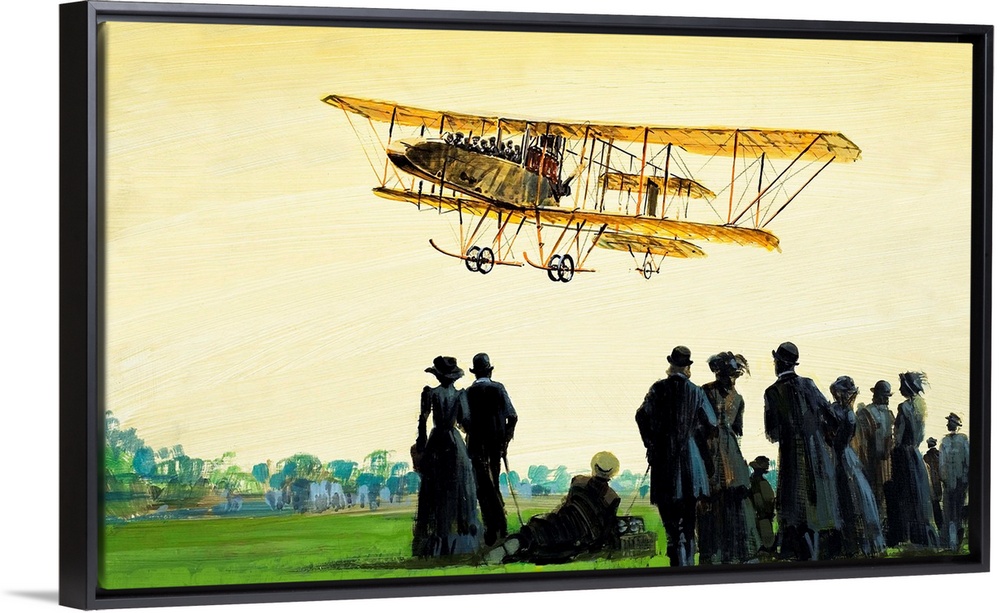<p>Wings Across the World: Taking off... Claude Grahame-White carries eight passengers to set a new record for an aircraft. Original artwork for "Look and Learn," issue 864, 5 August 1978.</p>