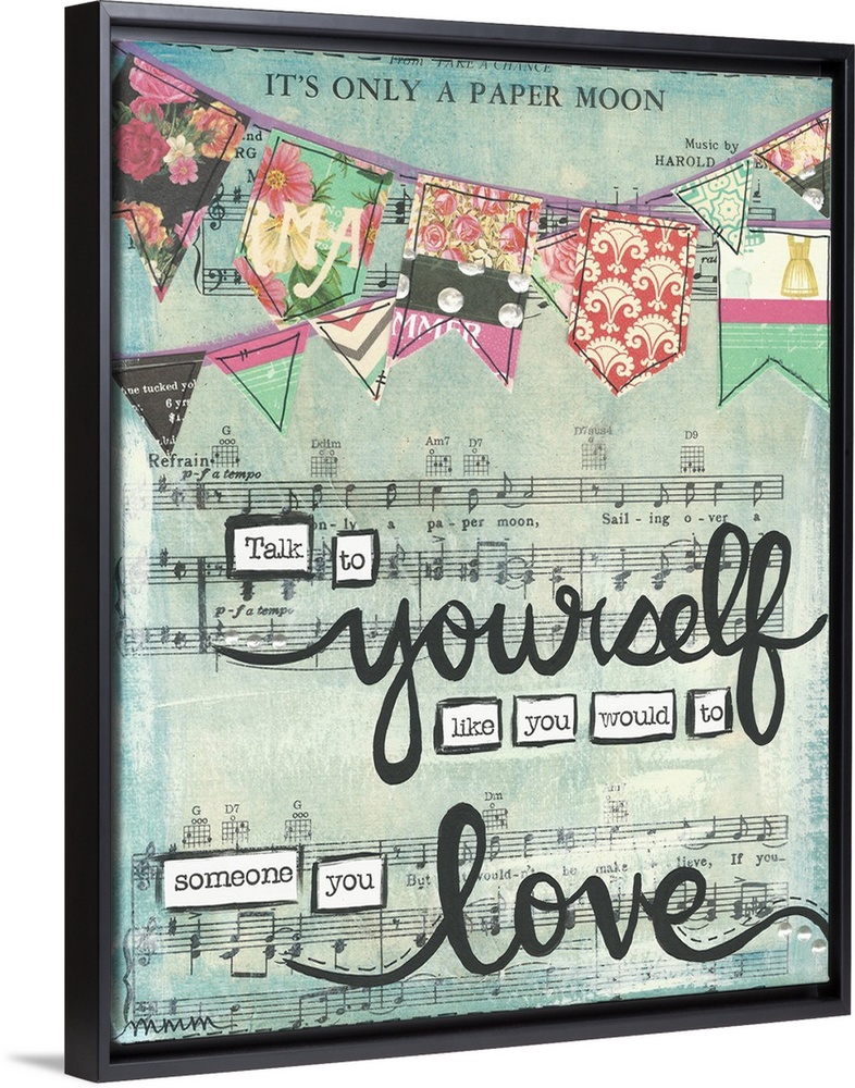 <p>"Talk To Yourself Like Your Would To Someone You Love" written on top of sheet music and created with mixed media.</p>