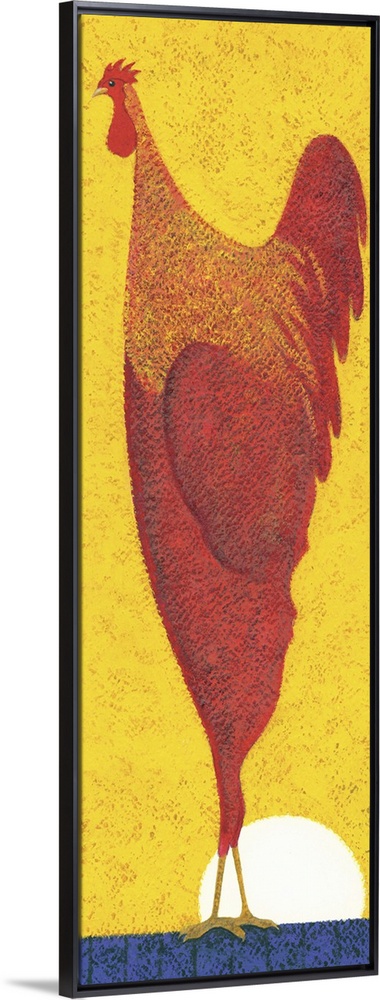 <p>Contemporary painting of a tall red chicken standing on a blue surface against a bright yellow sky with the sun on the horizon.</p>