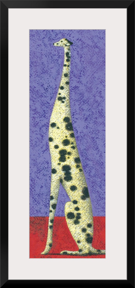 <p>Contemporary painting of a tall dalmatian sitting on a red surface against a purple background.</p>