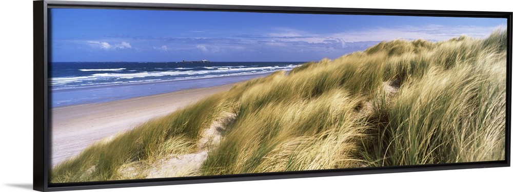 <p>Panoramic photograph of grass covered dunes along beach with ocean in the distance under a cloudy sky.</p>