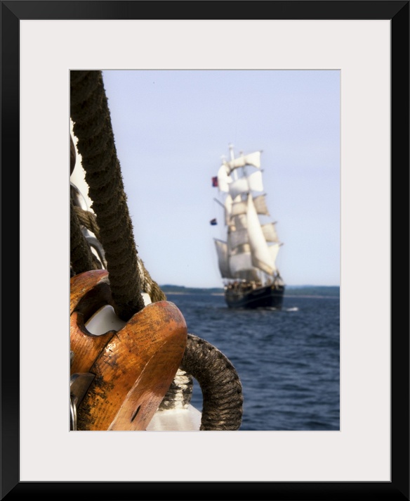 <p>A three mast, 47 meter dutch tall ship with all 16 sails deployed shot from on board of a swedish 32 meter schooner from 1945. On the schooner in the foreground, there is a wooden block and rope visible.</p>