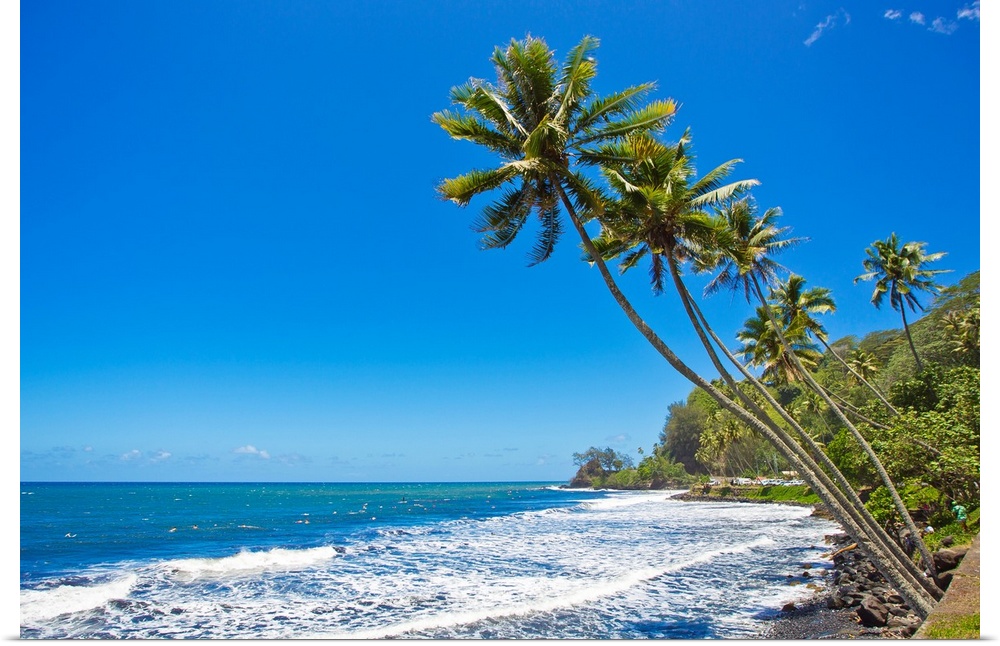 <p>Tall and skinny palm trees line the coast of Tahiti in the French Polynesian islands.</p>