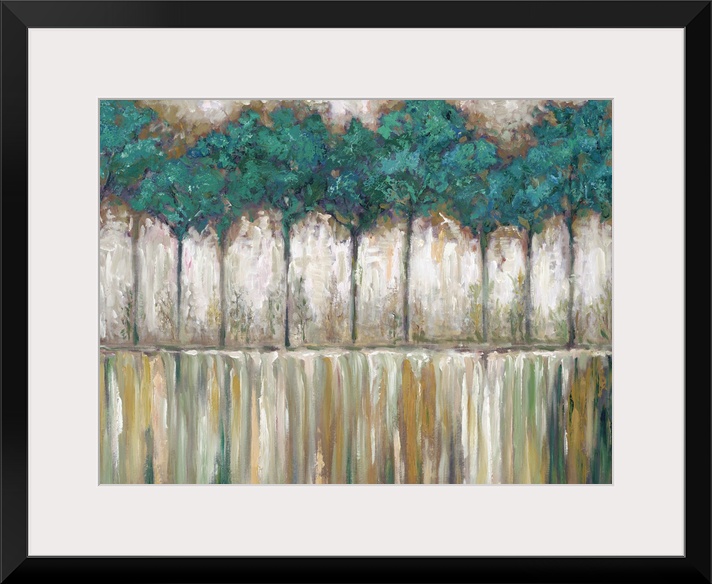 <p>Contemporary painting of a row of slender trees with leafy branches.</p>