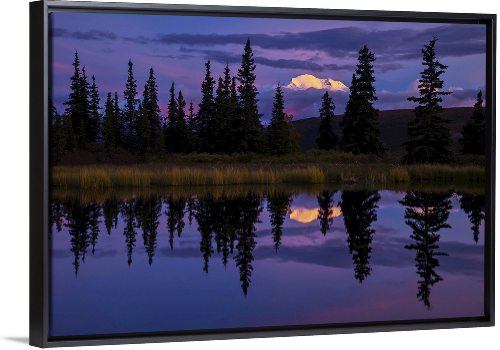 <p>Tall trees reflected in a pond with Mt. McKinley in the distance.</p>