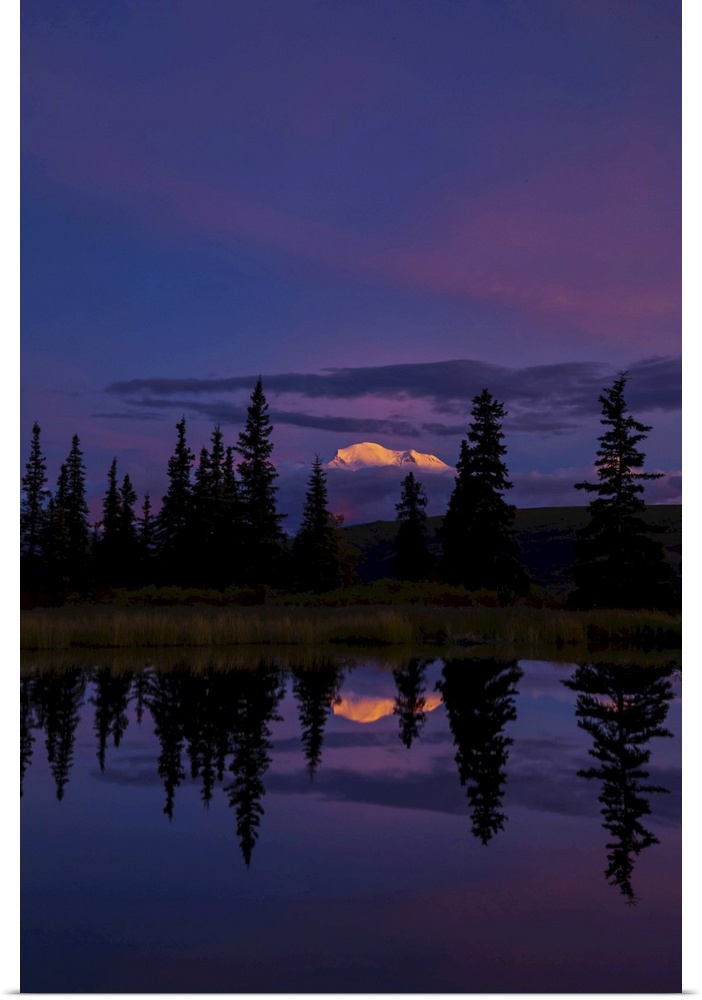 <p>Tall trees reflected in a pond with Mt. McKinley in the distance.</p>