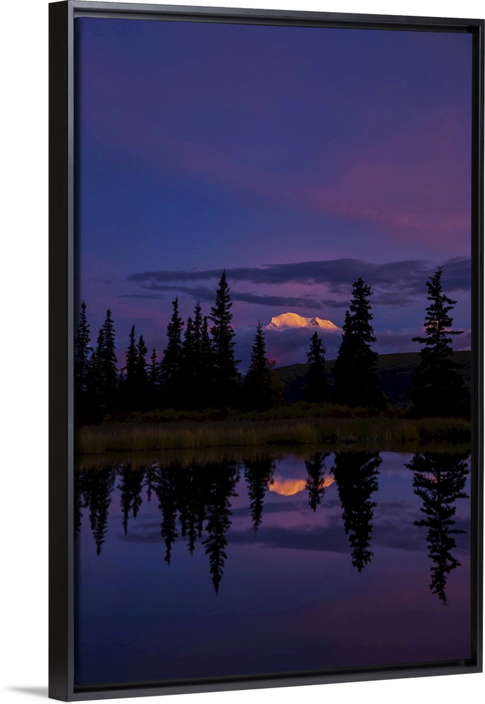<p>Tall trees reflected in a pond with Mt. McKinley in the distance.</p>