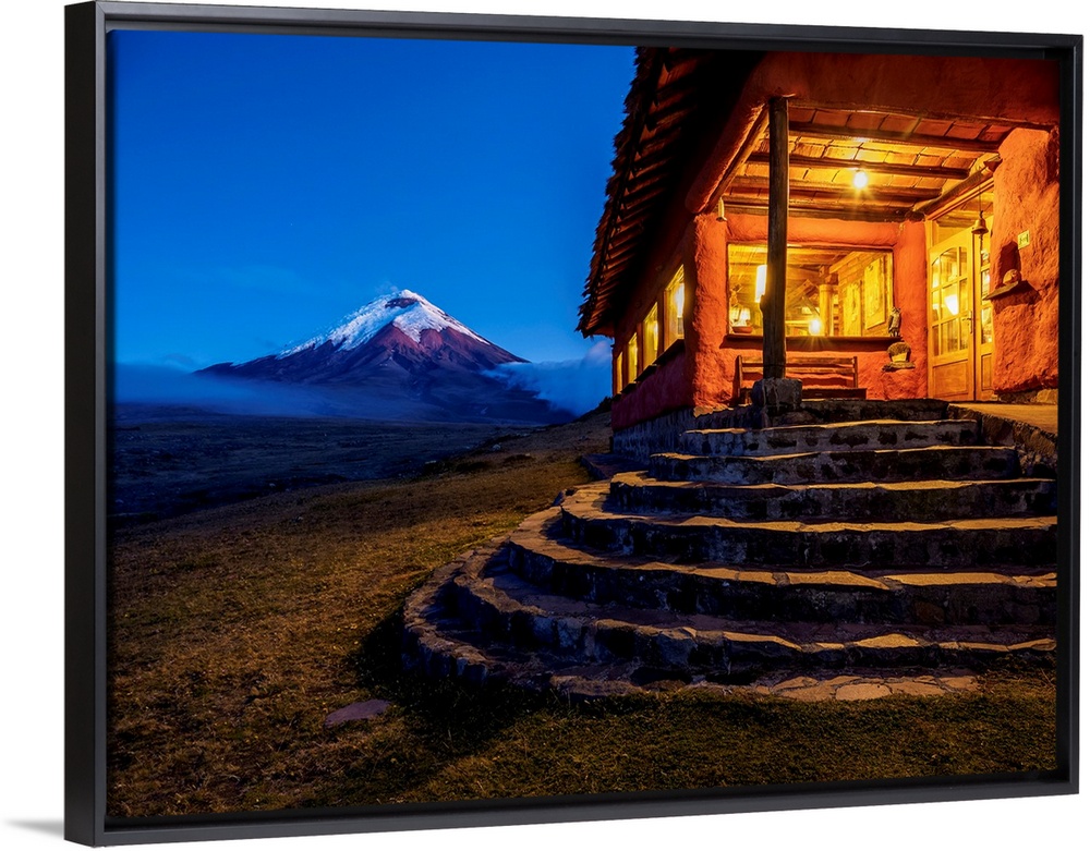 <p>Tambopaxi Mountain Shelter and Cotopaxi Volcano at twilight, Cotopaxi National Park, Cotopaxi Province, Ecuador.</p>