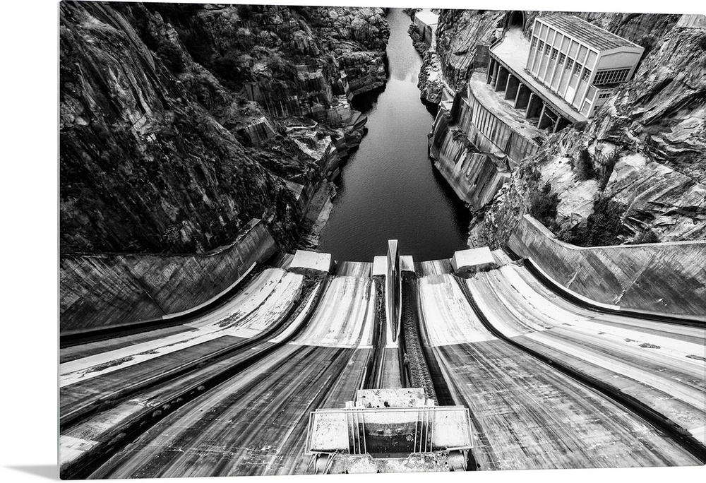 <p>Looking down the slope of the Picote dam toward the river gorge, Portugal.</p>