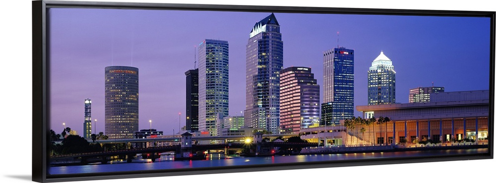 <p>Wide angle photograph of the Tampa skyline in front a vivid sky, lit up at night and reflecting in the water.</p>