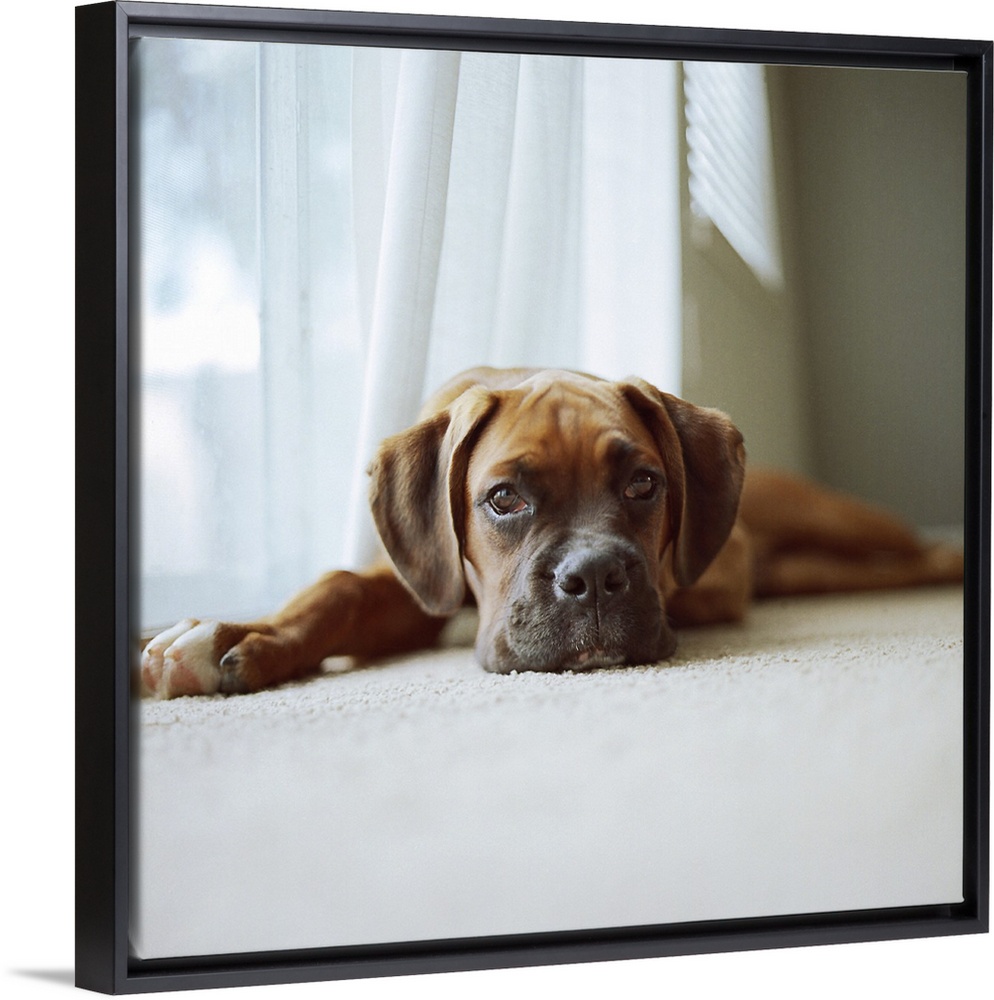 <p>Tan boxer puppy laying on carpet near window looking at camera with white curtains and gray walls.</p>