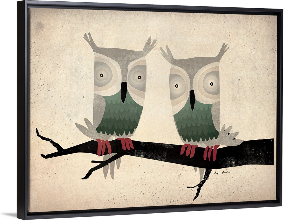 <p>Horizontal, large artwork of two owls perched on a single branch, on a neutral, speckled background.</p>