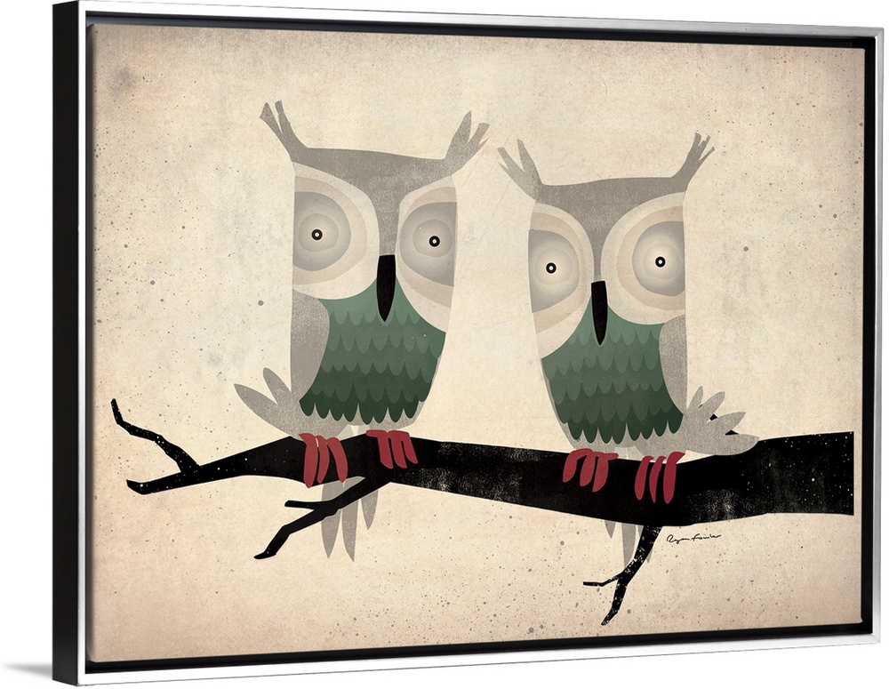 <p>Horizontal, large artwork of two owls perched on a single branch, on a neutral, speckled background.</p>