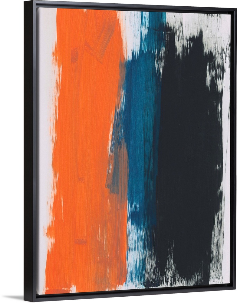 <p>Abstract painting of bold vertical brush strokes in orange, blue and black on a light gray background.</p>
