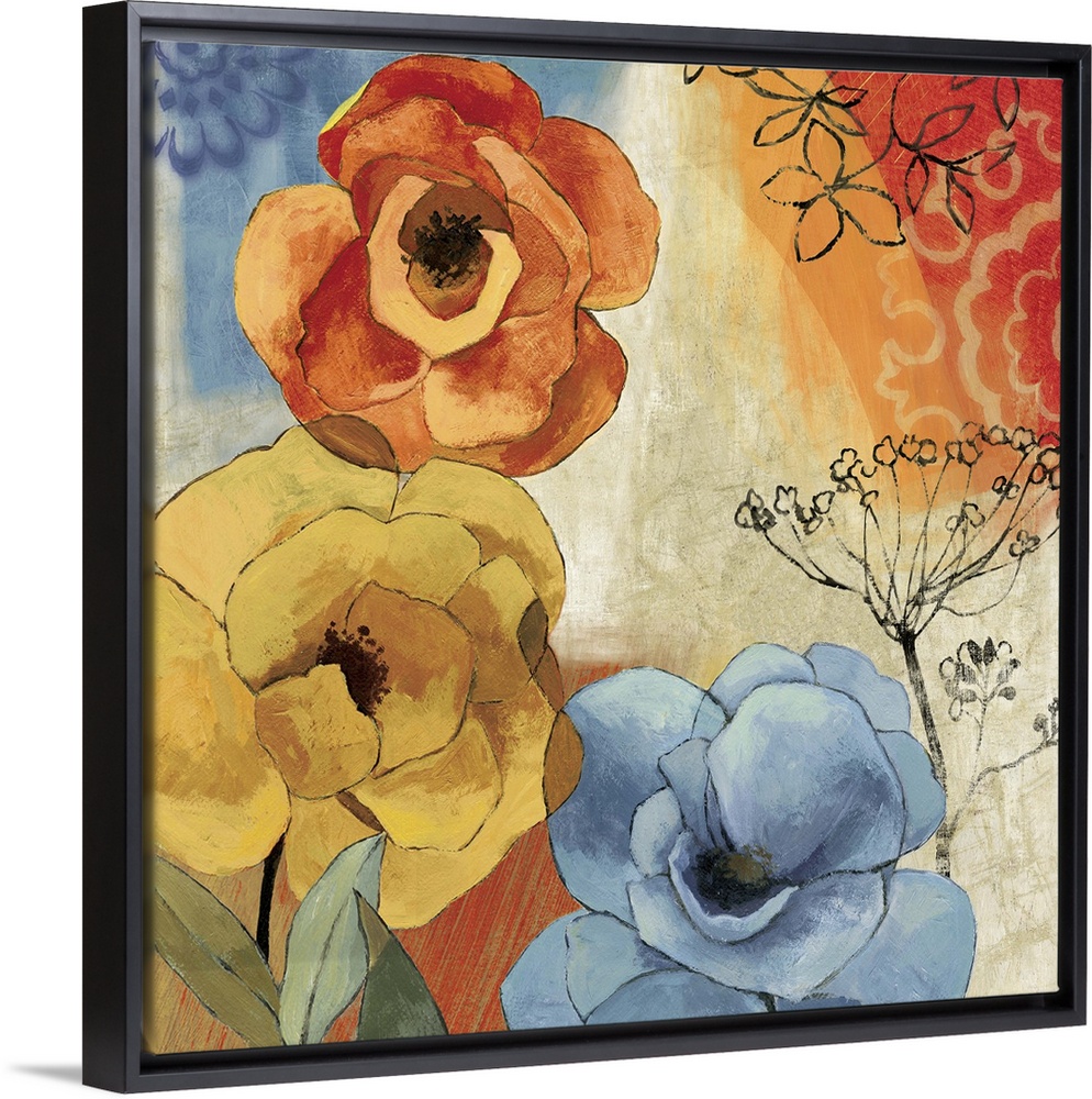 <p>Contemporary home decor artwork of colorful flowers against a multi-colored background.</p>