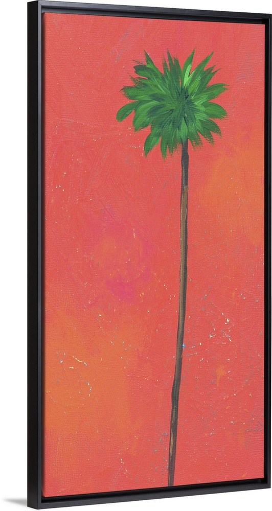 <p>Contemporary artwork of a tall palm tree with a thin trunk against a red background.</p>